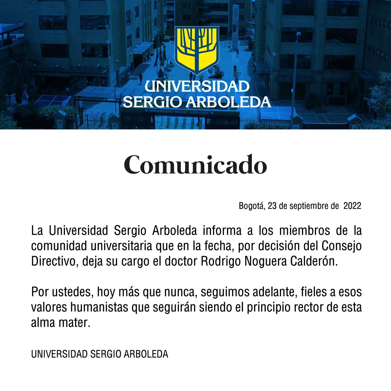 A través de un comunicado, la Junta Directiva de la Universidad Sergio Arboleda confirmó que el rector Rodrigo Noguera Calderón fue apartado de su cargo.