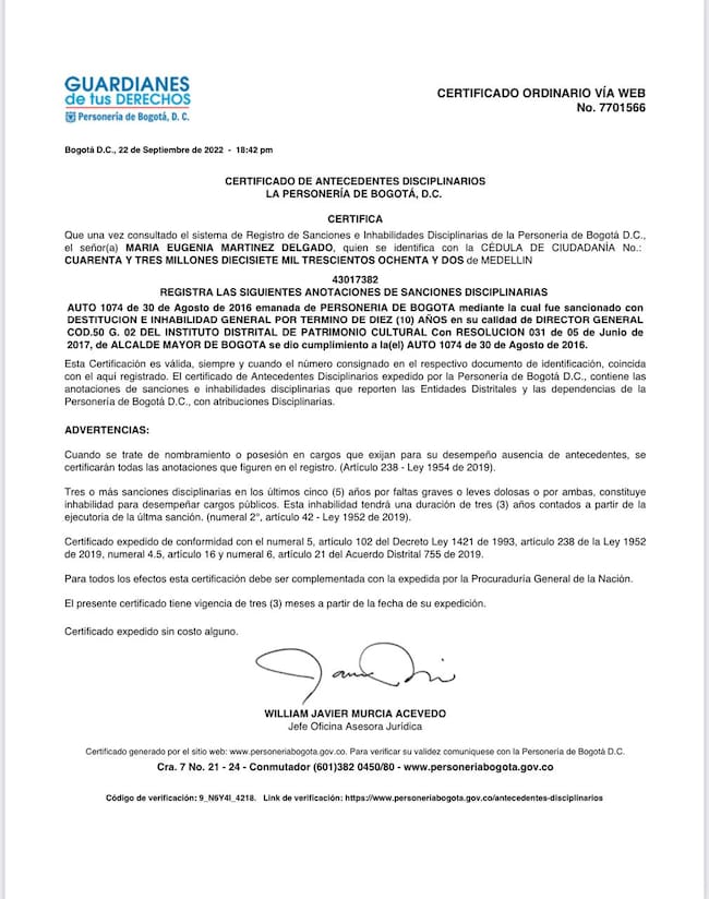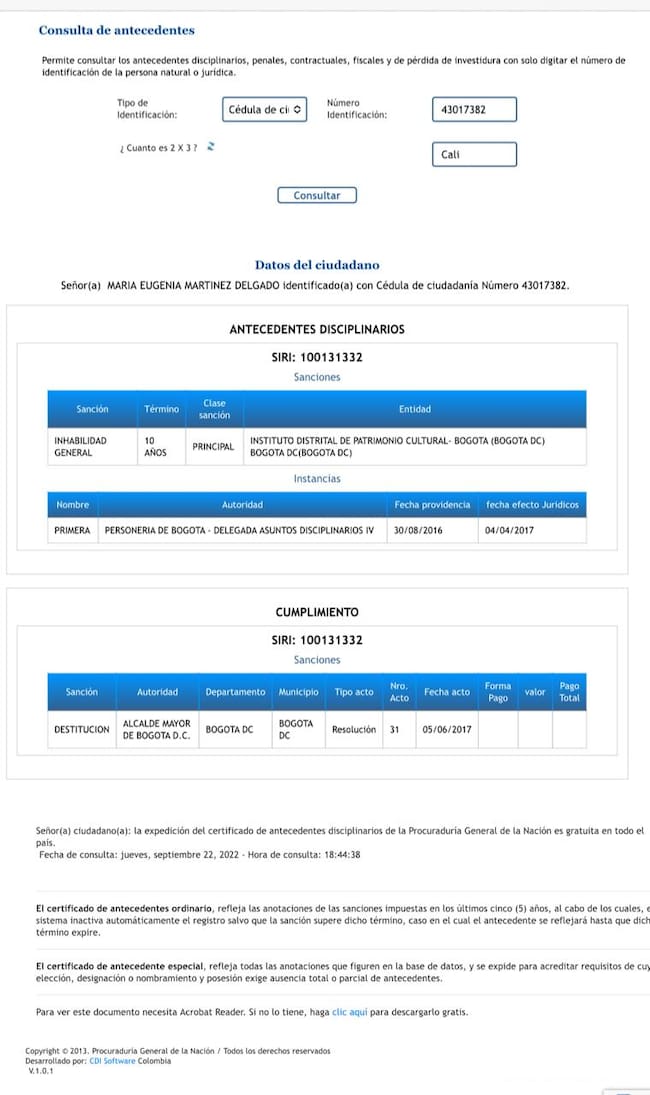 También consultamos con la Personería de Bogotá y antecedentes disciplinarios de la Procuraduría y efectivamente figura en los registros de servidores sancionados.