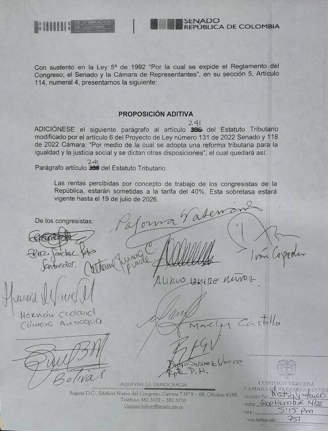 El documento fue firmado por los congresistas Paloma Valencia, Gustavo Bolívar, Iván Cepeda, Marelen Castillo, Erika Sánchez, Hernán Cadavid, Alirio Uribe y Pedro Suárez Vacca. Sin embargo, nos cuentan que la tarifa cambiará para lograr que el impuesto total a sus salarios sea del 20%.