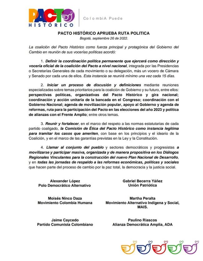 También tomaron la decisión de iniciar un proceso de discusión sobre temas prioritarios, como las perspectivas políticas, la coordinación con el Gobierno Nacional, la agenda de movilización popular, el apoyo al Gobierno y a su agenda de reformas, y la ruta para la participación de la coalición en las elecciones de 2023.