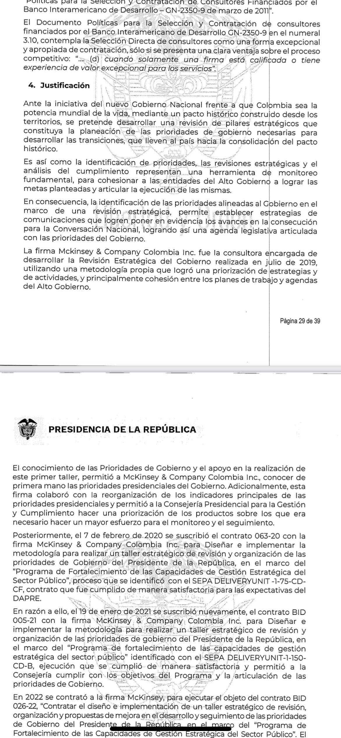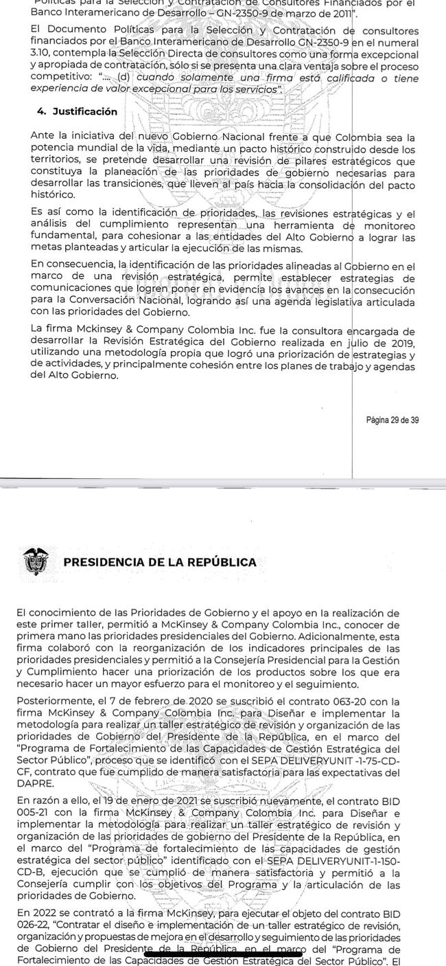 En la justificación del contrato también se puede leer, “ante la iniciativa del nuevo Gobierno Nacional frente a qué Colombia sea la potencia mundial de la vida, mediante un pacto histórico construido desde los territorios, se pretende desarrollar una revisión de pilares estratégicos que constituya la planeación de las prioridades de gobierno necesarias para desarrollar las transiciones, que lleven al país hacia la consolidación del pacto histórico”.