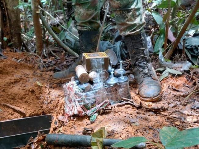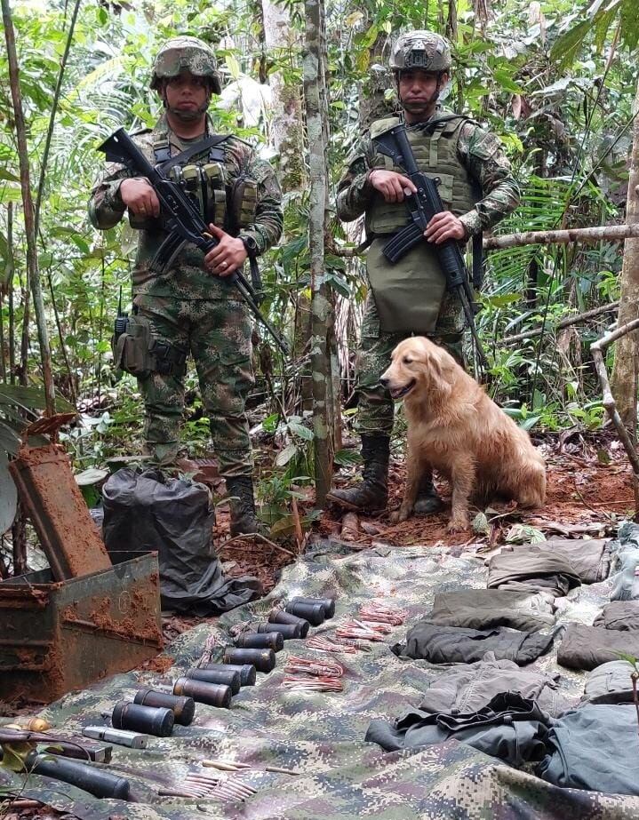 “Esta caleta que estaba enterrada fue detectada gracias al trabajo del binomio canino del Ejército Nacional, que esta entrenado y capacitado para la detección de explosivos como minas antipersona”, según el Ejército.