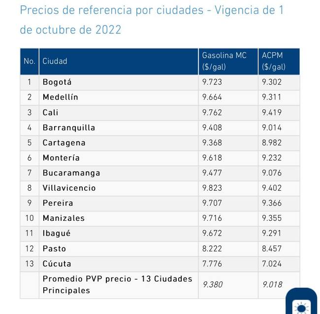 La Comisión de Regulación de Energía y Gas, CREG, señaló que los precios de referencia de los combustibles que regirán a partir de este sábado, según la ciudad, son: