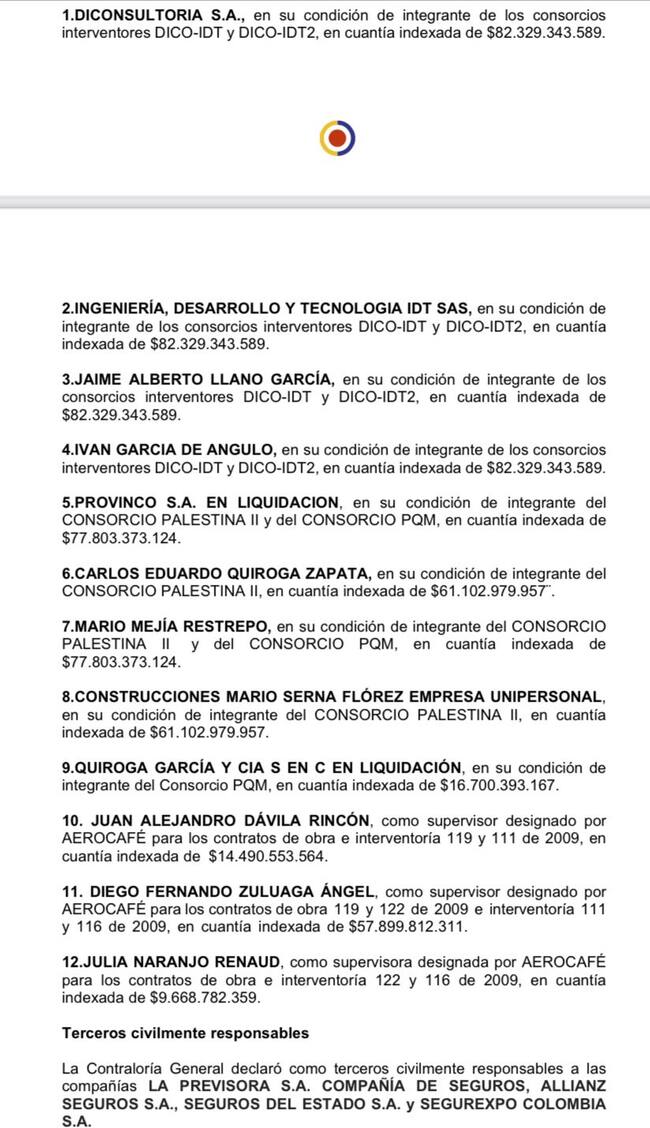 Según el fallo de primera instancia, proferido por la Contraloría Delegada Intersectorial No. 2 de la Unidad de Investigaciones Especiales Contra la Corrupción, “los recursos invertidos en los terraplenes 8 y 10 (obra de interventoría) corresponden a estructuras que no revisten utilidad ni cumplen la finalidad para lo cual fueron previstas, como era hacer parte funcional del Aeropuerto del Café”.