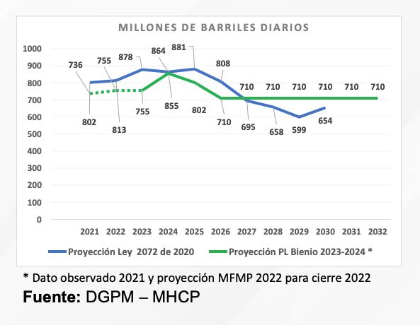 El proyecto de ley tiene las proyecciones de producción de petróleo de 10 años y advierte que el país pasará de producir unos 813.000 barriles de petróleo por día en 2022, a 710.000 barriles por día en 2026. Es decir, bajará la producción de petróleo, pero no proyecta frenarlo.