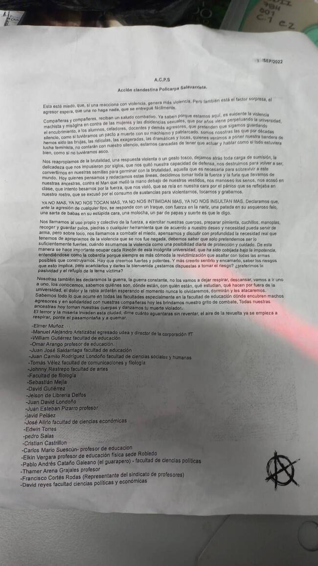 Francisco Cortés, profesor de la Universidad de Antioquia y quien aparece en la lista de este panfleto, indicó que las mujeres tienen la libertad de luchar y reclamar por sus derechos, pero en este caso se plantean “acciones violentas”.