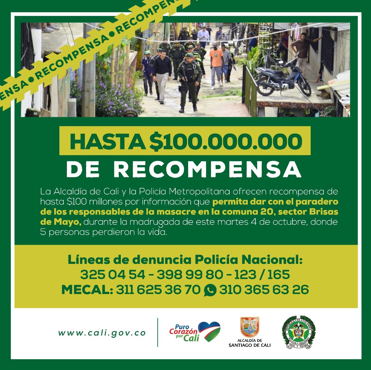 Tras un Consejo Extraordinario de Seguridad, el alcalde de Cali, Jorge Iván Ospina, anunció una recompensa de hasta cien millones de pesos para capturar a los responsables del atentado sicarial en el barrio Brisas de Mayo, ladera occidental de la ciudad, que deja cinco personas muertas y dos heridas.