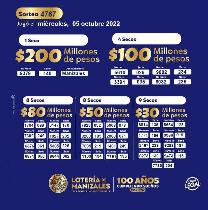 Entérese de los resultados del sorteo 4767 de la Lotería de Manizales del 5 de octubre de 2022.