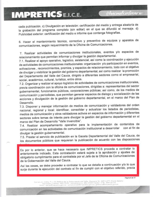 “Esta contratación estará sujeta a la aprobación y ajustes de obligatorio cumplimiento para el contratista por el Jefe de la Oficina de Comunicaciones de la Gobernación del Valle del Cauca.