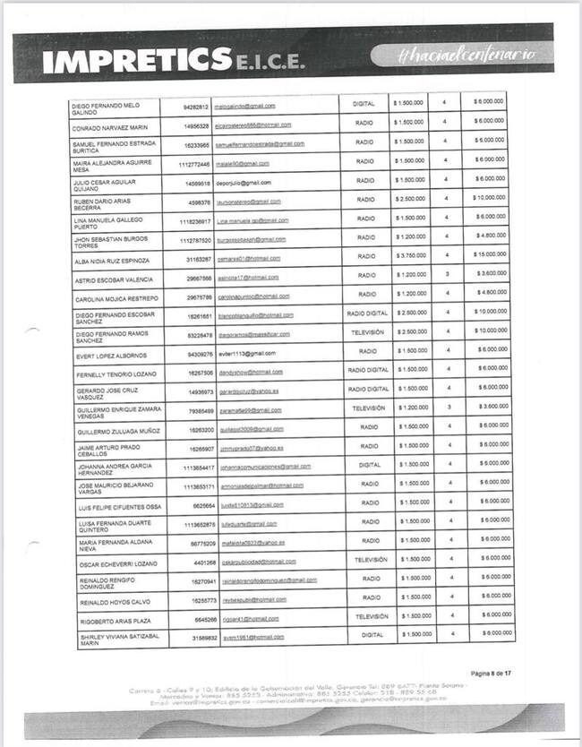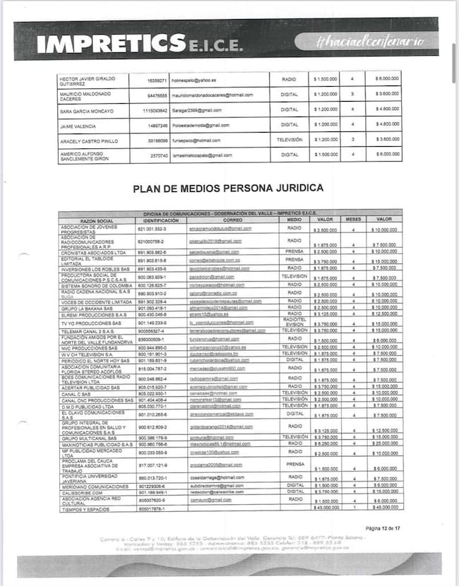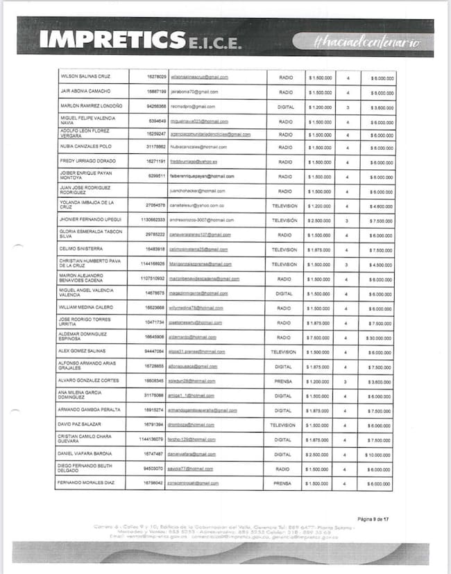 Un certificado de disponibilidad presupuestal de Impretics advierte que se cuenta con $9.100 millones para ejecutar dicho contrato, ¿dónde quedan los $2.577.857.400 restantes?, esta es quizás la primera pregunta que resulta de hacer un simple cálculo matemático, porque no hay claridad de la ganancia que se queda en las arcas de la antigua Imprenta del Valle.