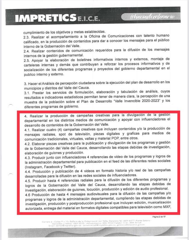 Pero también dice que se debe “Producir junto con influenciadores cuatro referencias de video de los programas y logros de la administración departamental para publicación en el feed de las diferentes redes sociales (Instagram, Facebook y Twitter)”.
