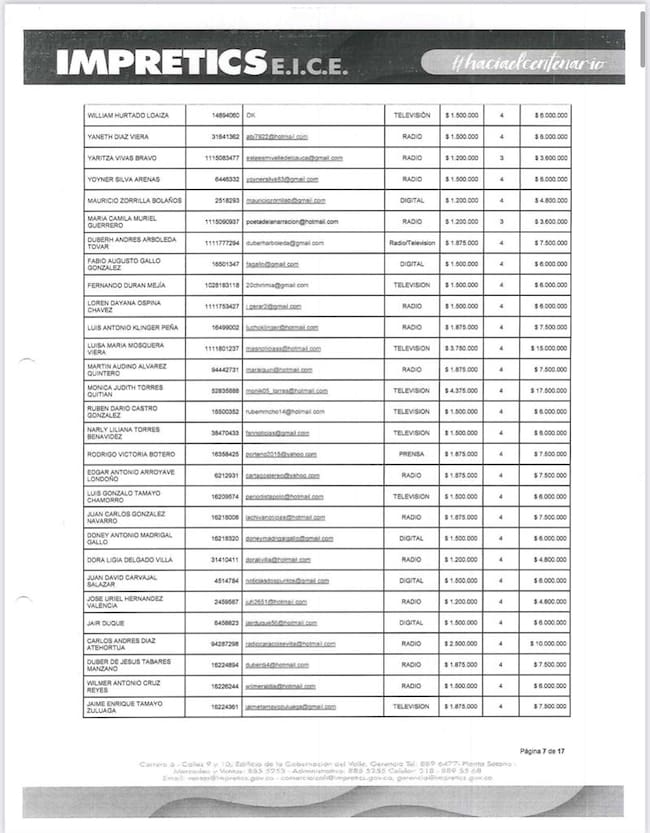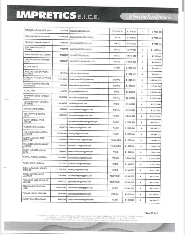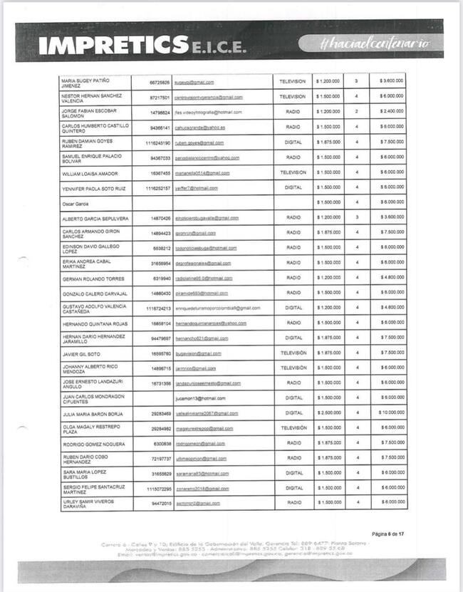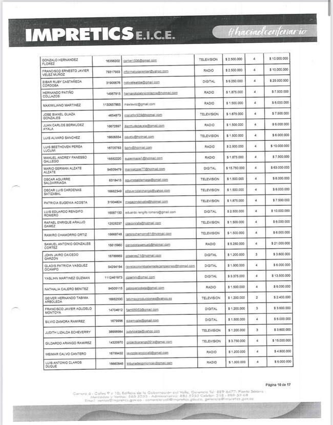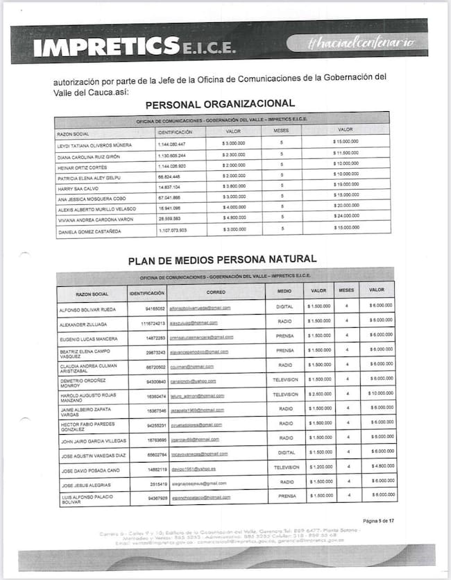 Todos estos comunicadores fueron vinculados como contratistas por tres, cuatro y/o cinco meses y en el Secop se pueden consultar sus hojas de vida y demás documentos que hacen parte de los requisitos para contratar con el Estado y en el contrato se advierte lo siguiente: