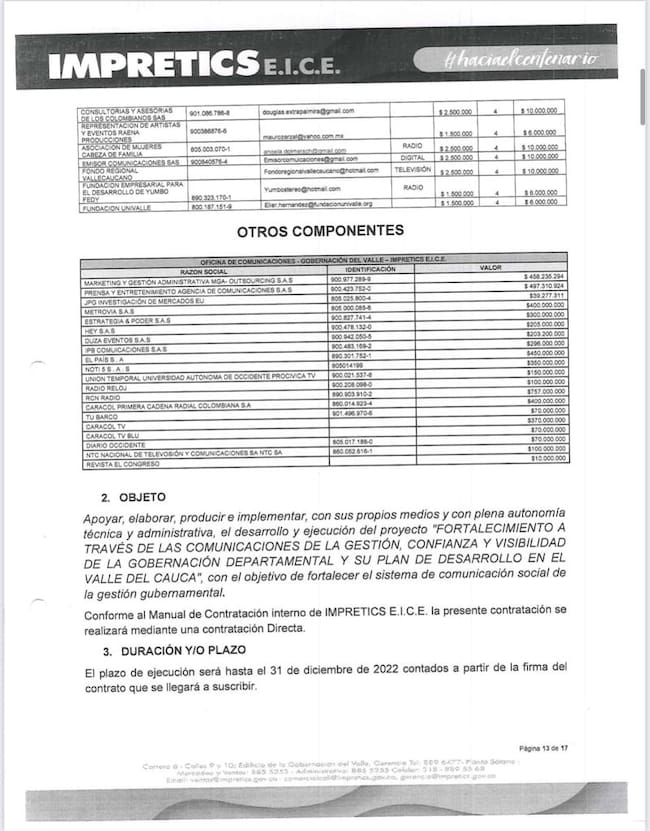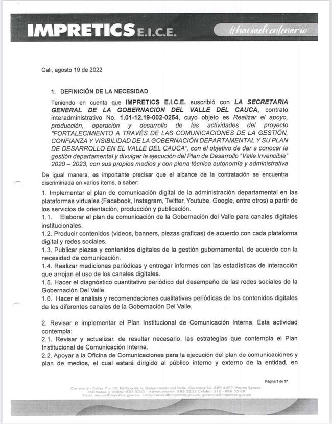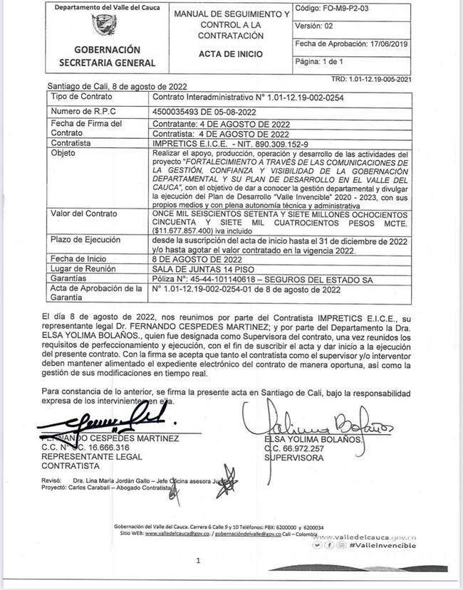 “Realizar el apoyo, producción, operación y desarrollo de las actividades del proyecto ‘Fortalecimiento a través de las comunicaciones de la gestión, confianza y visibilidad de la Gobernación Departamental y su Plan de Desarrollo en el Valle del Cauca’ con el objetivo de dar a conocer la gestión departamental y divulgar la ejecución del Plan de Desarrollo ‘Valle Invencible’ 2020 - 2023, con sus propios medios y con plena autonomía técnica y administrativa”, dice el acta de inicio.