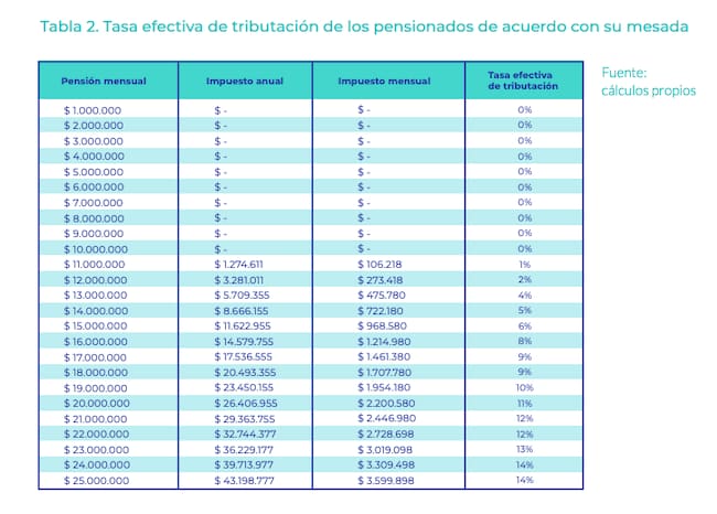 Según el Observatorio Fiscal de la Universidad Javeriana, se analizó el impacto de la reforma tributaria en los pensionados. Actualmente, las pensiones tienen una exención de $38 millones mensuales. En el proyecto de reforma tributaria aprobado en primer debate la exención se reduciría a $5,7 millones mensuales. Las pensiones se suman a la cédula general y por lo tanto cuentan con un esquema de tarifas marginales.