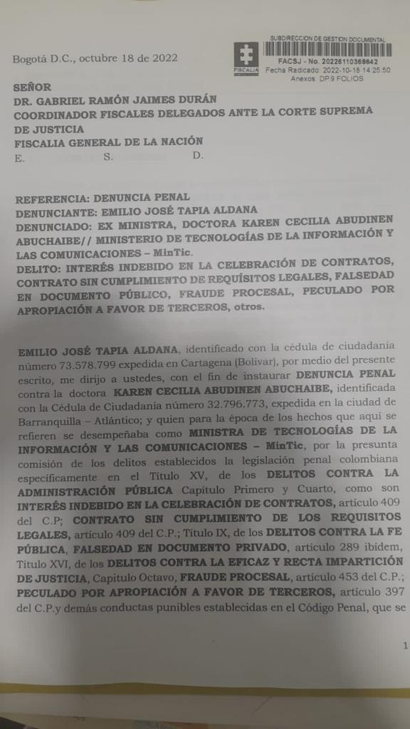 En 9 folios conocidos por El Reporte Coronell, Tapia denuncia penalmente a la exministra Karen Abudinen como presunta autora de los delitos de: