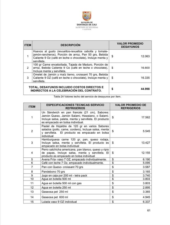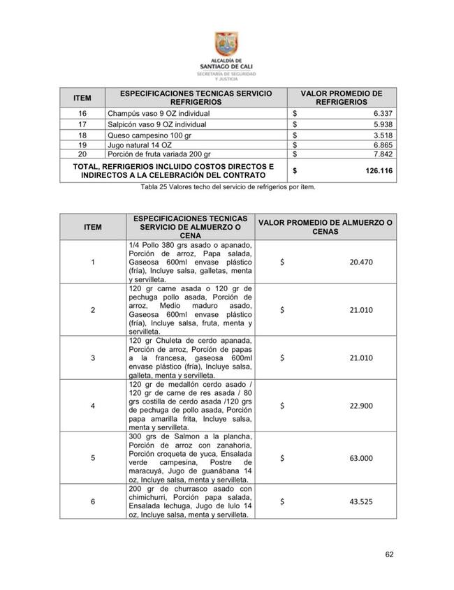 Así las cosas, encontramos en la página 61 los menús que se deben ofertar y el precio base promedio de cada uno de estos.