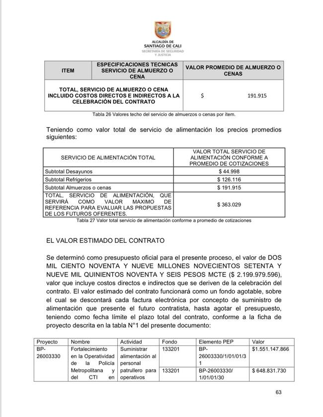 En la Secretaría de Seguridad y Justicia de Cali avanza un llamativo proceso de licitación que busca suministrar alimentación para policías que participen en los operativos que se lleven a cabo durante lo que resta de este año y cuyo valor supera los dos mil millones de pesos. El proceso actualmente se encuentra en la presentación de ofertas.