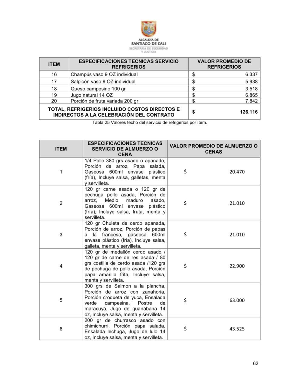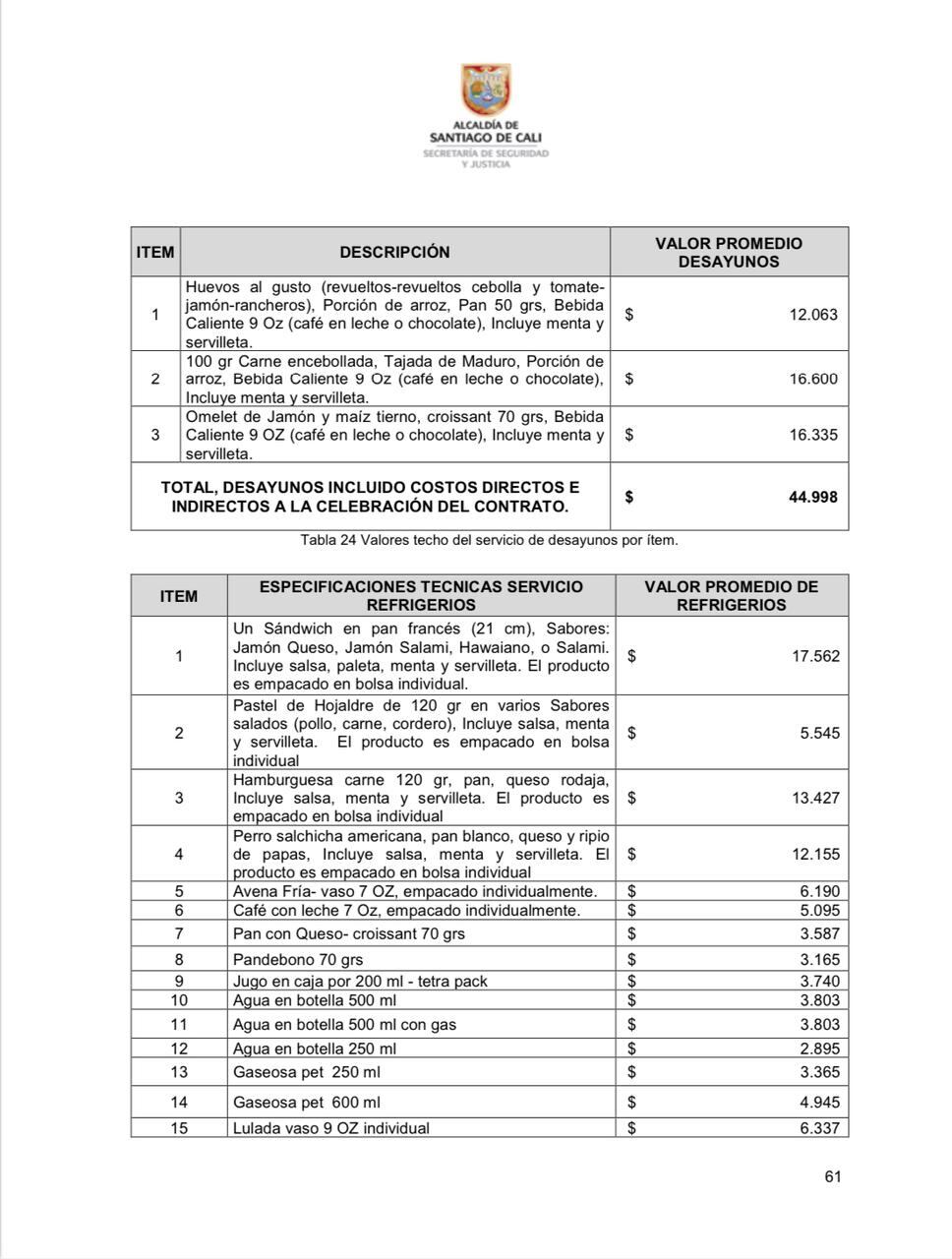 Así las cosas, encontramos en la página 61 los menús que se deben ofertar y el precio base promedio de cada uno de estos.