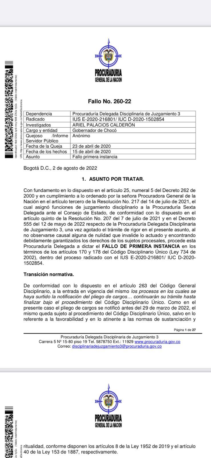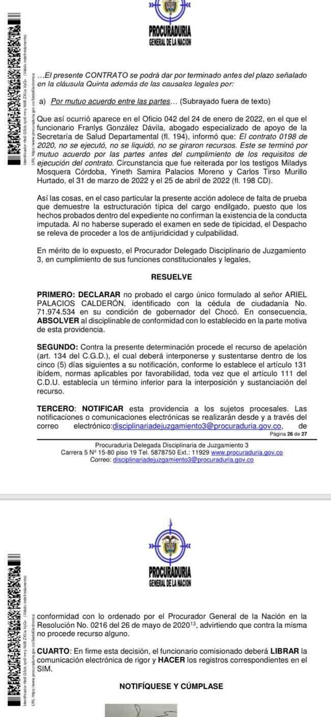 Sin embargo, el exgobernador de Chocó, Ariel Palacios, está en casa por cárcel porque el Tribunal Superior de Bogotá determinó que si era responsable de corrupción en el departamento, le imputaron cargos y, en ese momento, se libró una medida de aseguramiento que lo mantiene en casa por cárcel. Sin embargo, hoy disciplinariamente el Ministerio Público determinó que no era responsable.