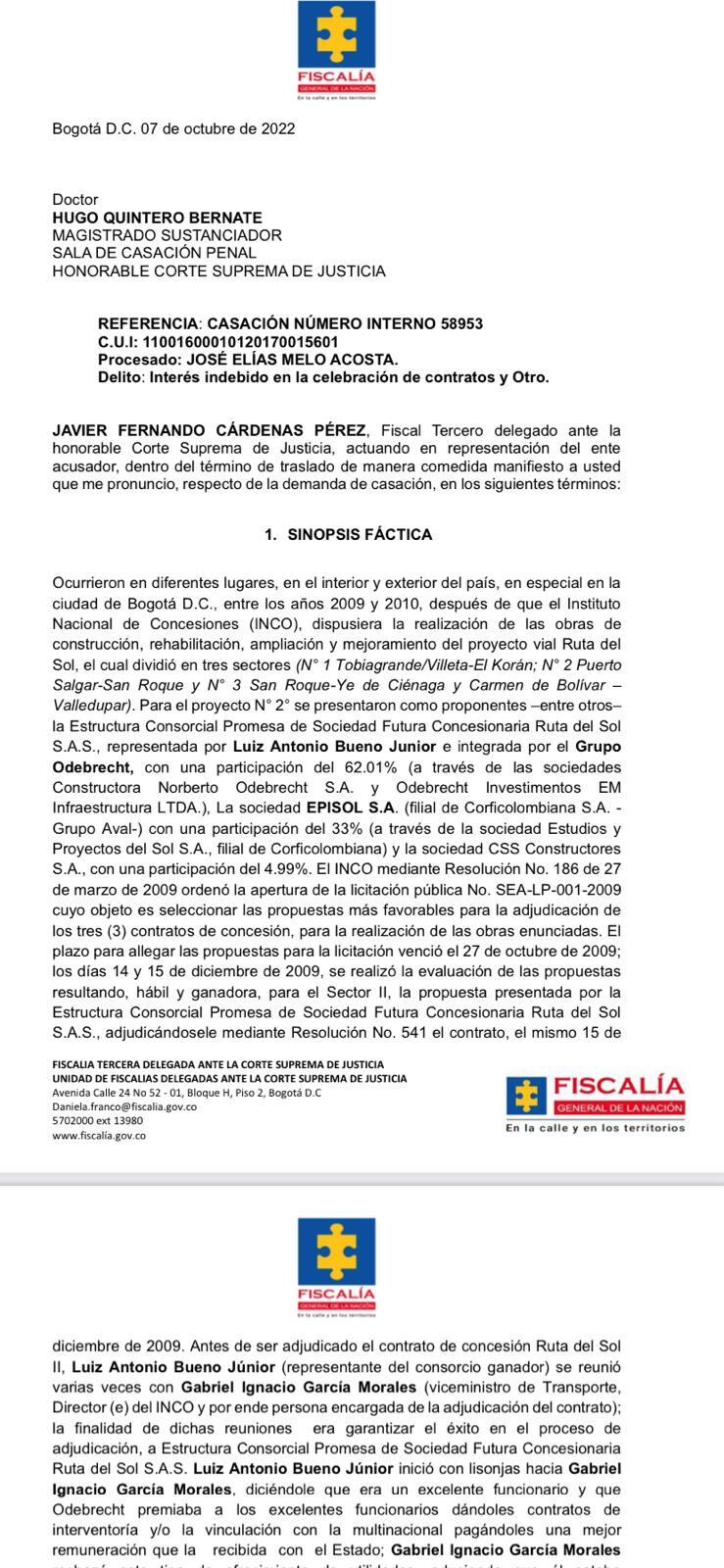 La Procuraduría y Fiscalía General de la Nación le piden a la Corte Suprema de Justicia dejar en firme la condena del expresidente de Corficolombiana José Elías Melo Acosta, quien fue condenado en 2020 por Odebrecht.