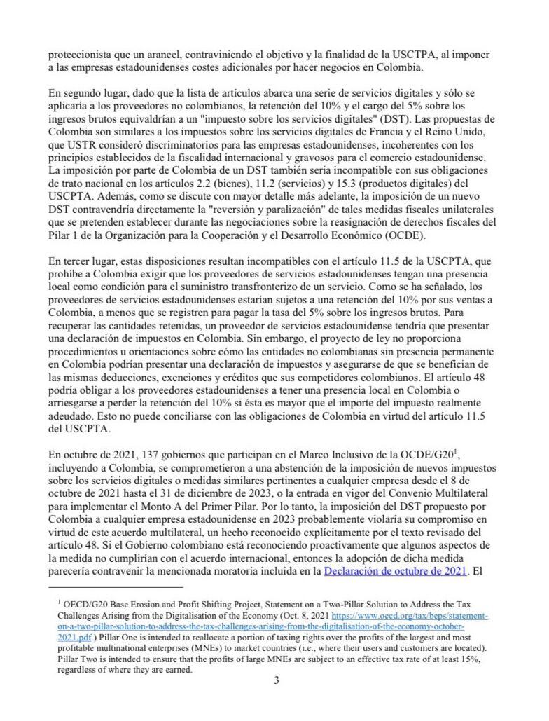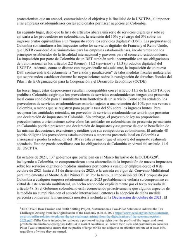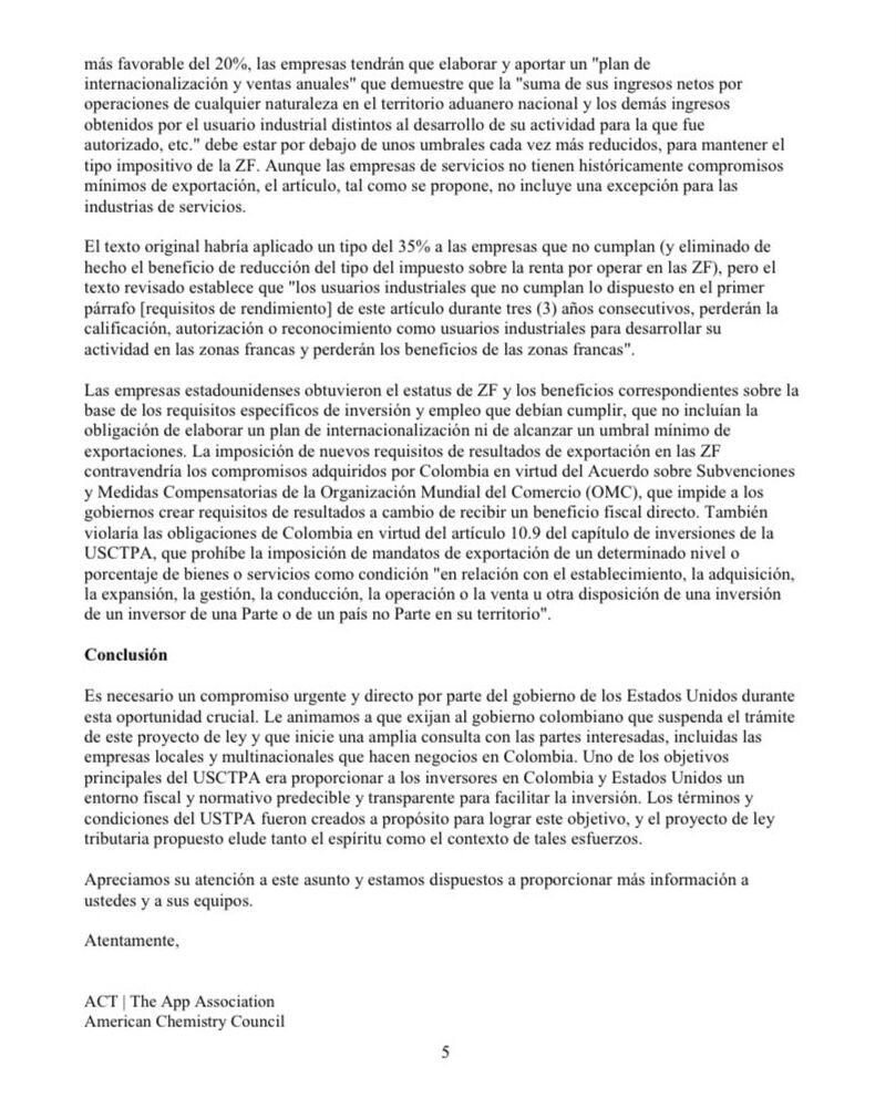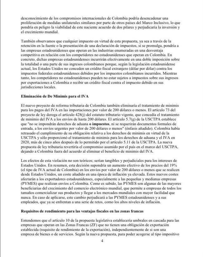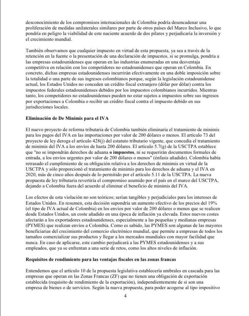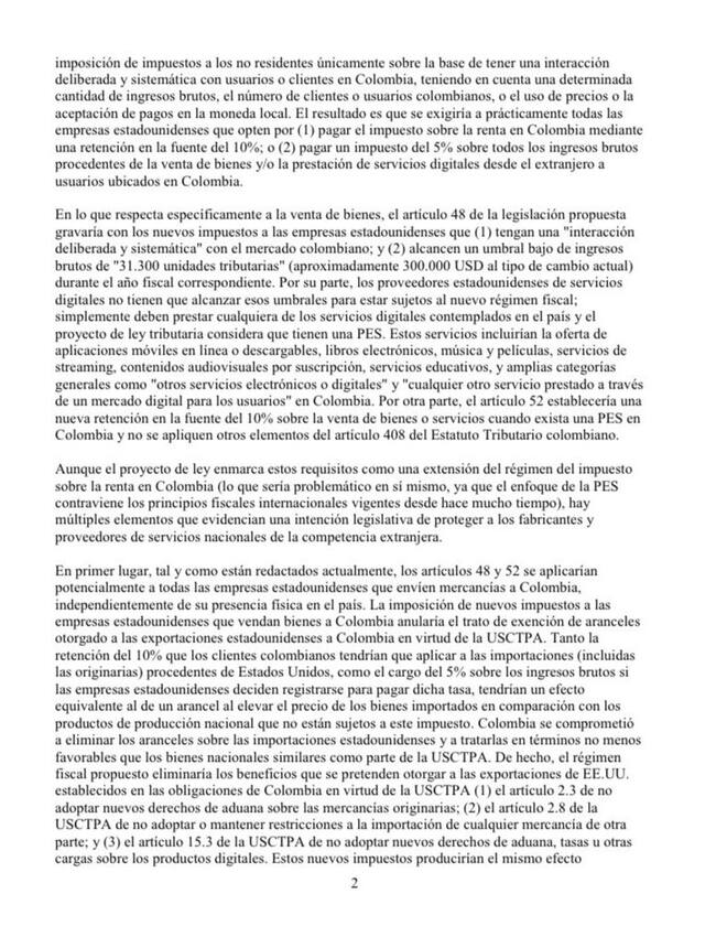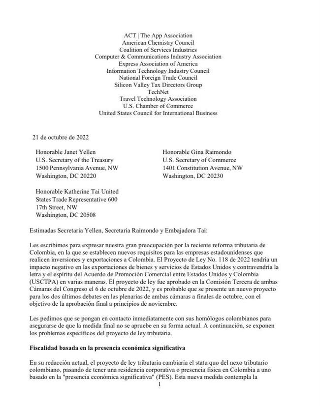 La comunicación inicia expresando lo siguiente: “Les escribimos para expresar nuestra gran preocupación por la reciente reforma tributaria de Colombia, en la que se establecen nuevos requisitos para las empresas estadounidenses que realicen inversiones y exportaciones a Colombia”.