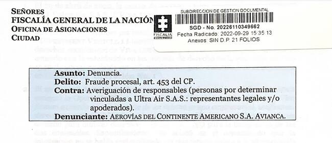 La W conoció que la aerolínea Avianca presentó una denuncia ante la Fiscalía General de la Nación contra la empresa Ultra Air por el delito de fraude procesal, luego de determinar que esa empresa, que es su competencia, habría entregado información falsa a la Aeronáutica Civil.