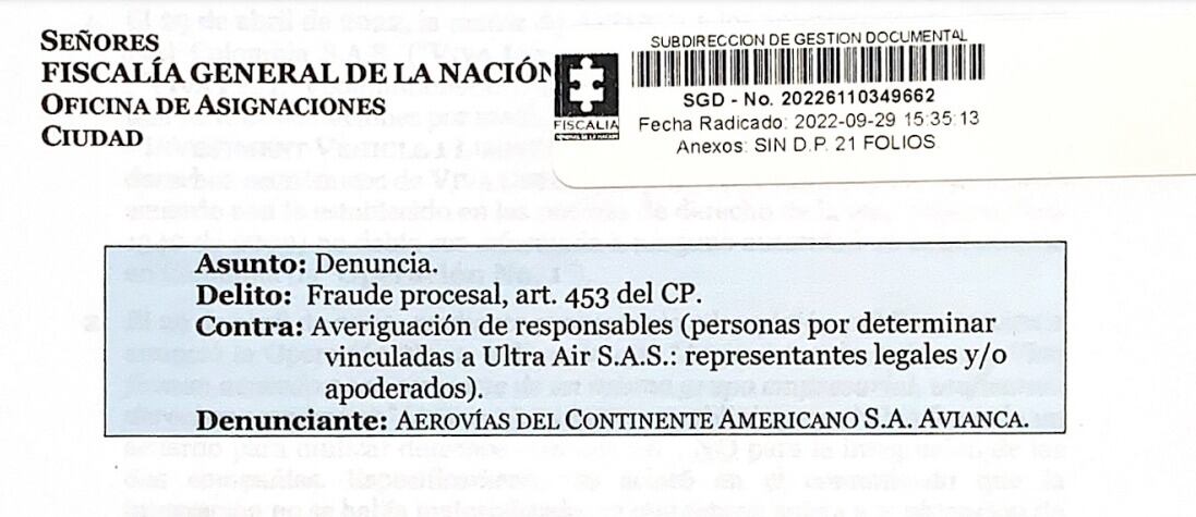 La W conoció que la aerolínea Avianca presentó una denuncia ante la Fiscalía General de la Nación contra la empresa Ultra Air por el delito de fraude procesal, luego de determinar que esa empresa, que es su competencia, habría entregado información falsa a la Aeronáutica Civil.