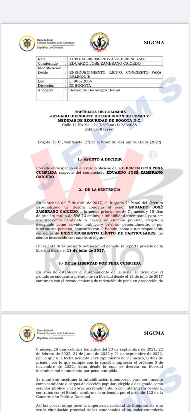 La pena de casi 6 años que tenía que pagar Zambrano, condenado en abril de 2017 por el delito de enriquecimiento ilícito de particulares, ya quedó con su respectivo paz y salvo, por lo que el juzgado 17 de ejecución de penas y medidas de seguridad de Bogotá libró la boleta de libertad.