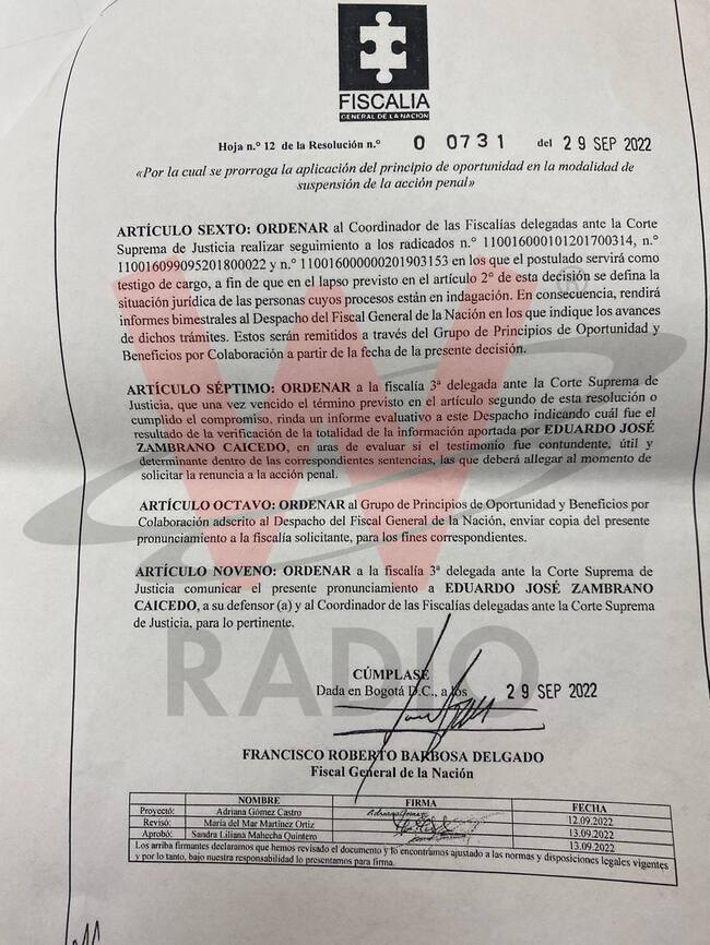 El documento de 12 páginas conocido por La W le da una prórroga al principio de oportunidad que Zambrano pactó en un comienzo con la Fiscalía para ser procesado únicamente por uno de los cuatro delitos de los que era señalado.