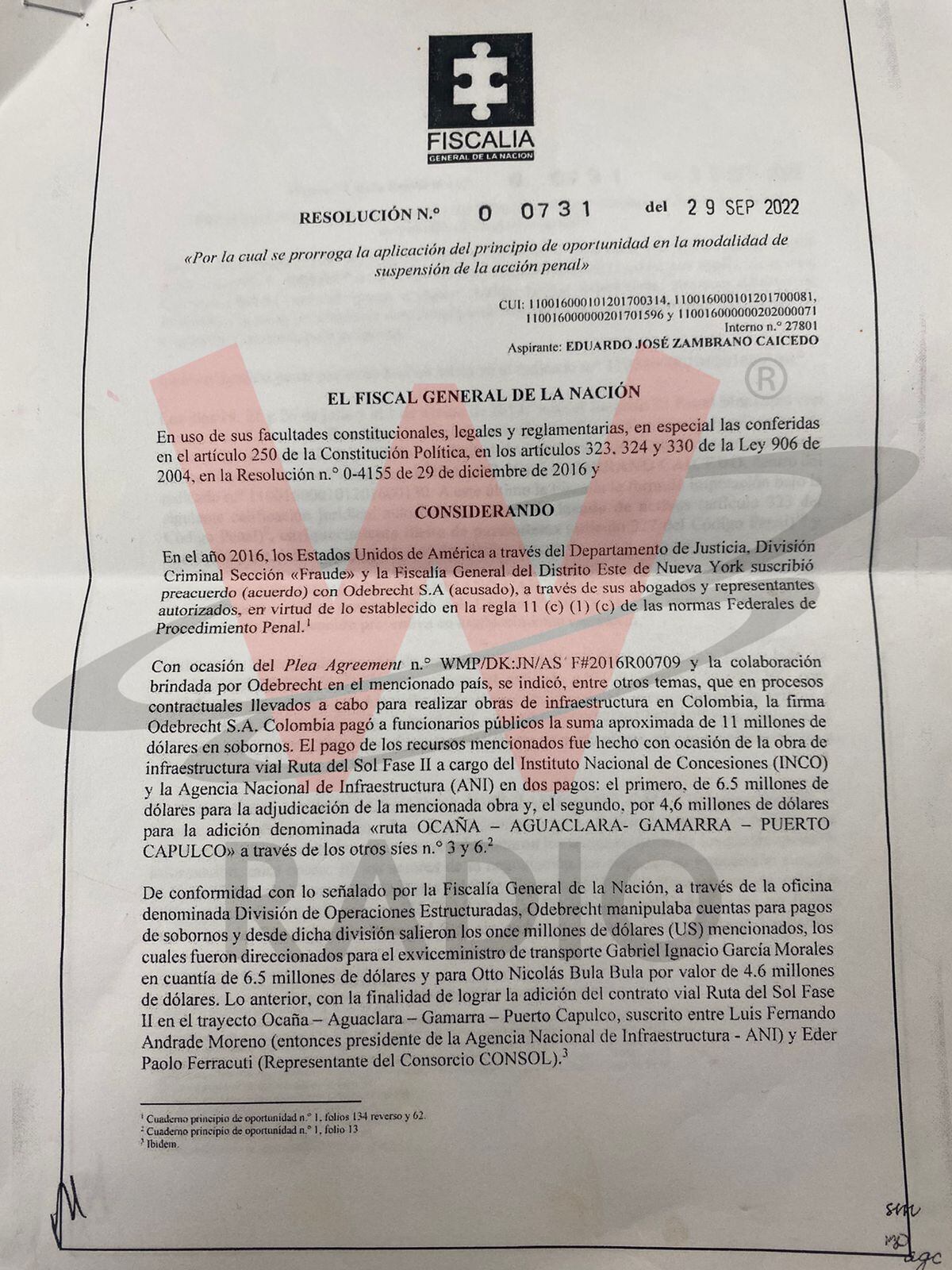 La W también conoció en primicia un nuevo principio de oportunidad que firmó el fiscal general de la Nación, Francisco Barbosa, a favor de Eduardo Zambrano el pasado 29 de septiembre de 2022, en el que entre otras órdenes le pide a la delegada de la Corte Suprema de Justicia citar a las víctimas de Odebrecht a una audiencia de control de legalidad, la cual se deberá llevar a cabo el próximo año para darle cumplimiento a este acuerdo.