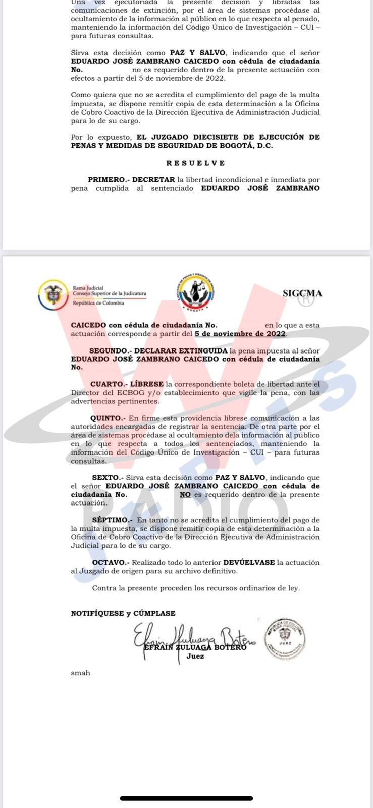 La pena de casi 6 años que tenía que pagar Zambrano, condenado en abril de 2017 por el delito de enriquecimiento ilícito de particulares, ya quedó con su respectivo paz y salvo, por lo que el juzgado 17 de ejecución de penas y medidas de seguridad de Bogotá libró la boleta de libertad.