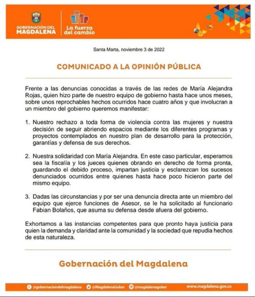 Luego de la denuncia de presunto abuso sexual por parte de la ex candidata a la Cámara María Alejandra Rojas, quien hizo parte del equipo de gobierno hasta hace unos meses, la Gobernación del Magdalena y el Movimiento Fuerza Ciudadana informaron a la opinión pública que rechazan el hecho y piden investigación a las autoridades.
