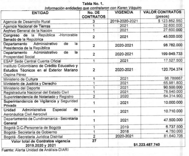 Algunas de las entidades en las que tuvo contratos fue la Agencia de Desarrollo Rural (tres por $123 millones), el Congreso de la República (dos por $45 millones), el Departamento Administrativo de Presidencia (dos por $98 millones), Icetex (dos por $120 millones), entre otras entidades, por las cuales tenía que pagar $112 millones y reportó un pago de $48 millones, y no informó a cada entidad sobre sus contratos adicionales.