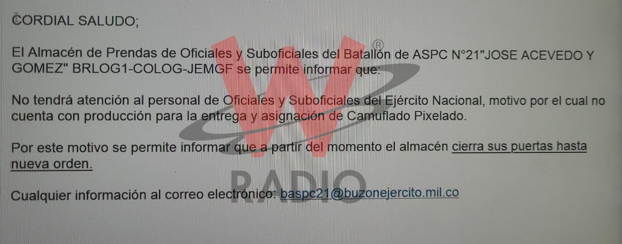 Sin embargo, agregan en el correo: “permito informar que a partir del momento el almacén cierra sus puertas hasta nueva orden. Cualquier información al correo electrónico baspc@buzonejercito.mil.co.”