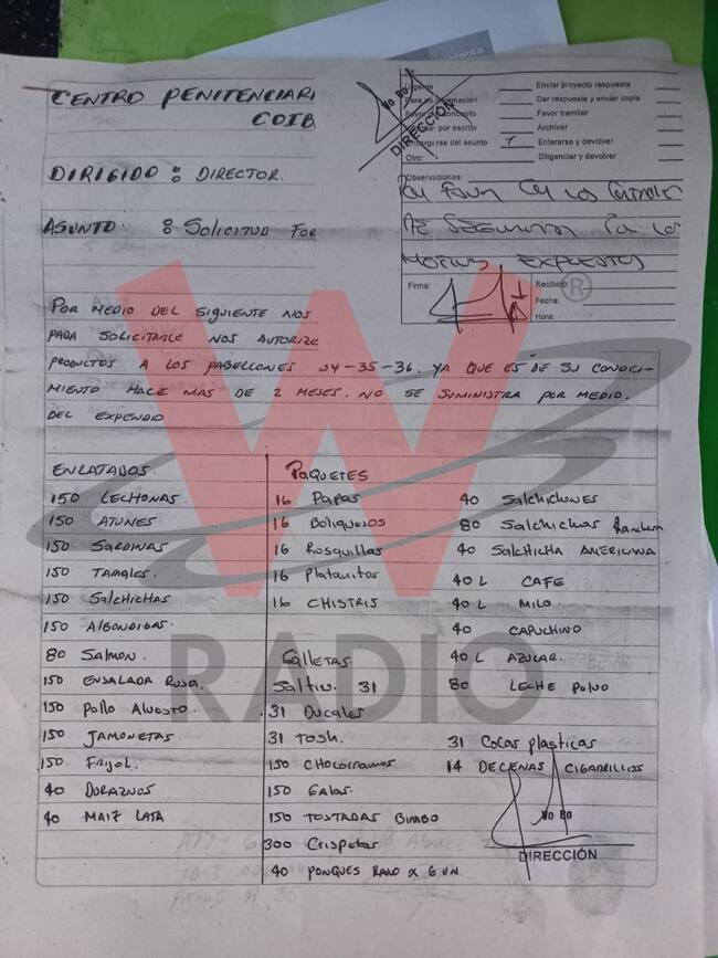 La W conoció el memorando en el que el director de esta cárcel firma y autoriza entrar varios elementos y alimentos, entre ellos: “lechona, salmón tostadas, galletas, milo, una dieta bien particular.