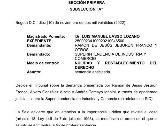 “Negar las pretensiones de la demanda de nulidad y restablecimiento de derecho formulada por los demandantes Ramón de Jesús Jesurún Franco, Álvaro González Álzate y Andrés Tamayo Lanini contra la Superintendencia de Industria y Comercio”, apartes del fallo.