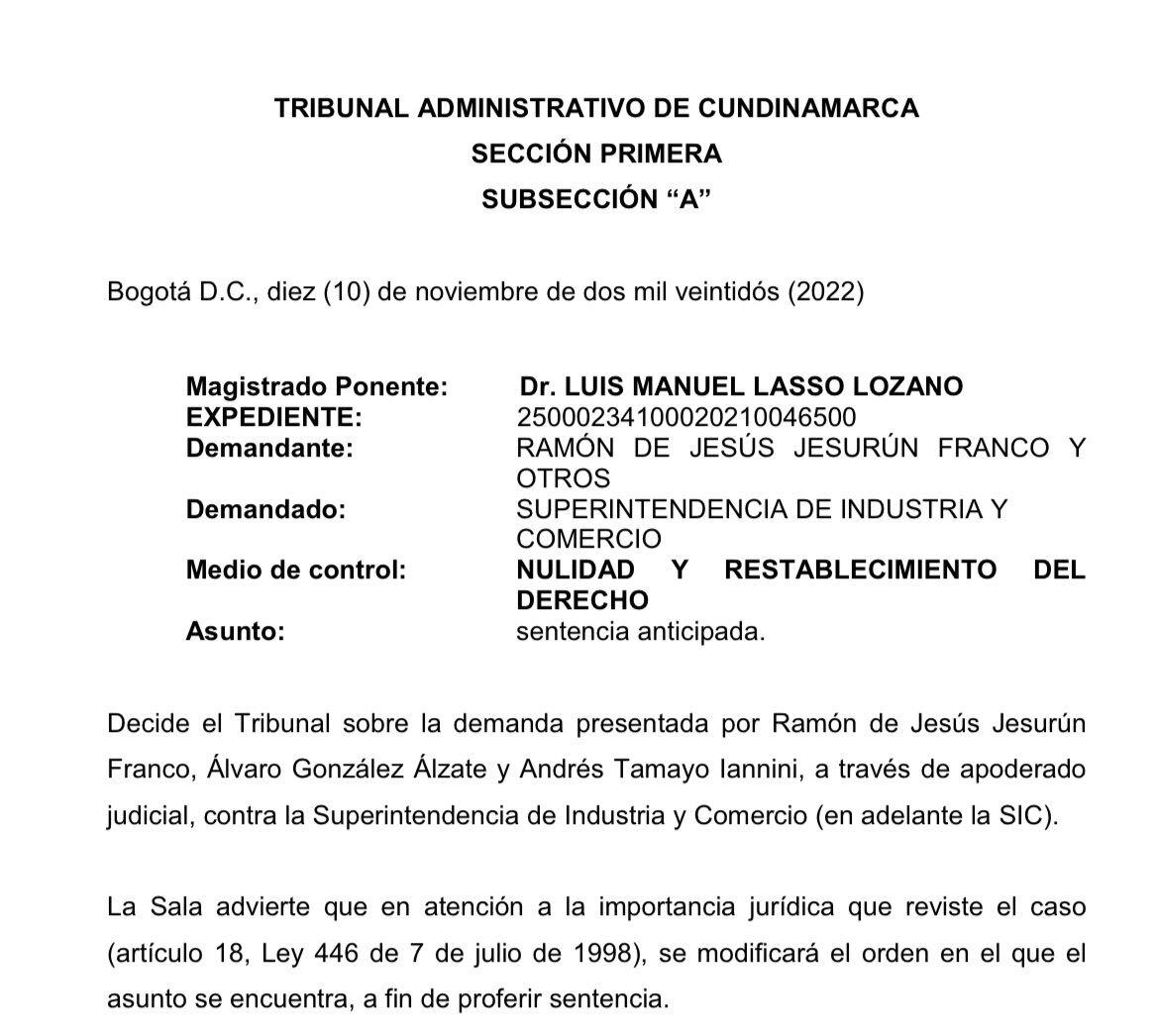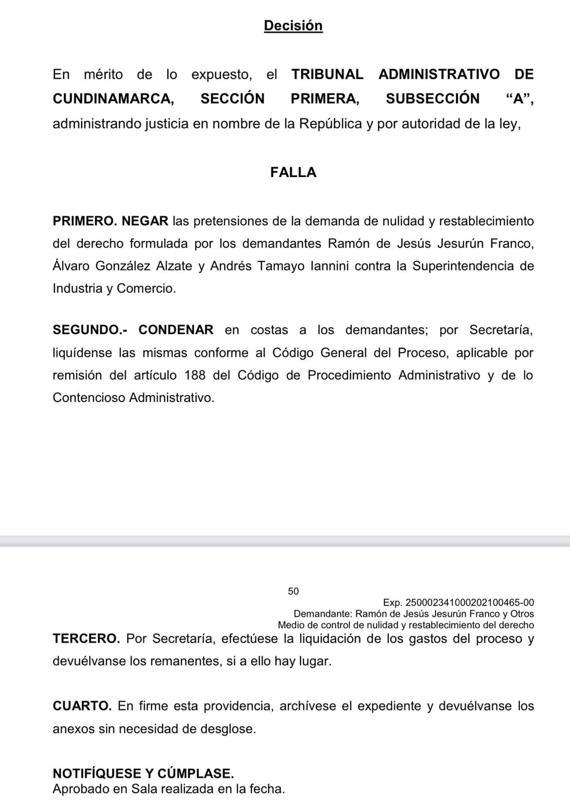“Negar las pretensiones de la demanda de nulidad y restablecimiento de derecho formulada por los demandantes Ramón de Jesús Jesurún Franco, Álvaro González Álzate y Andrés Tamayo Lanini contra la Superintendencia de Industria y Comercio”, apartes del fallo.