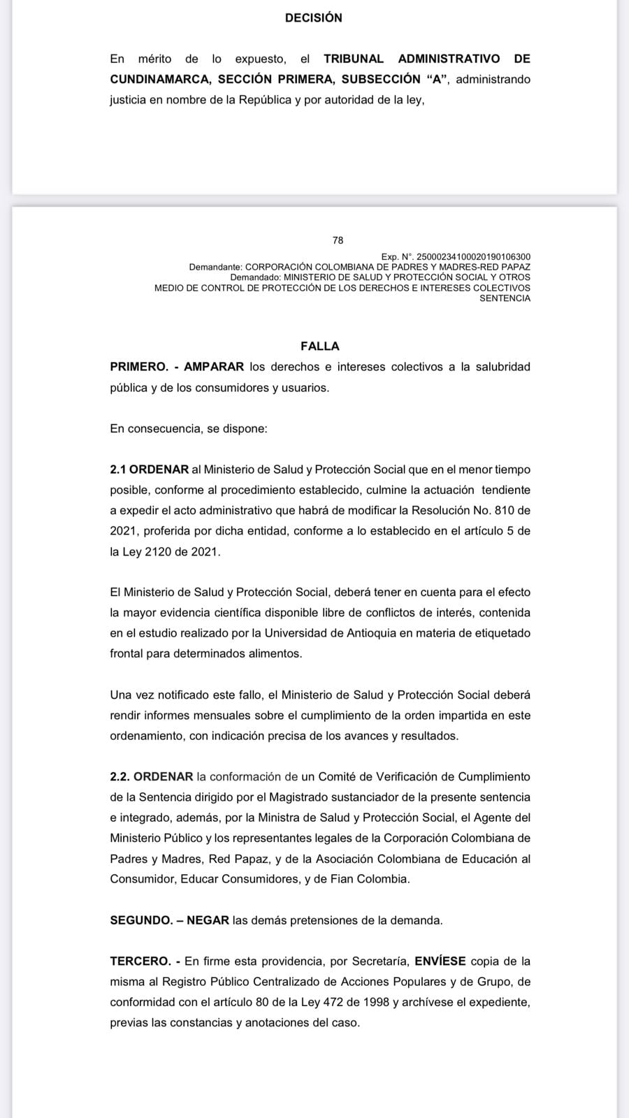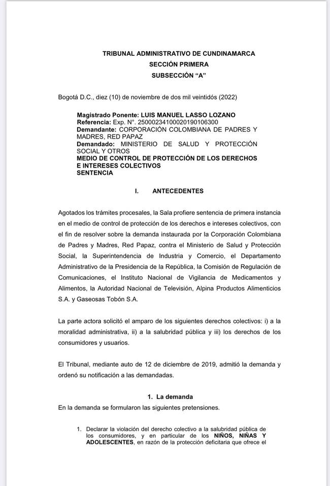 El tribunal decidió amparar el derecho a la salud pública de los consumidores colombianos argumentando que él etiquetados frontal de advertencia presenta mayor efecto en la captura de la atención y en la percepción de riesgo.