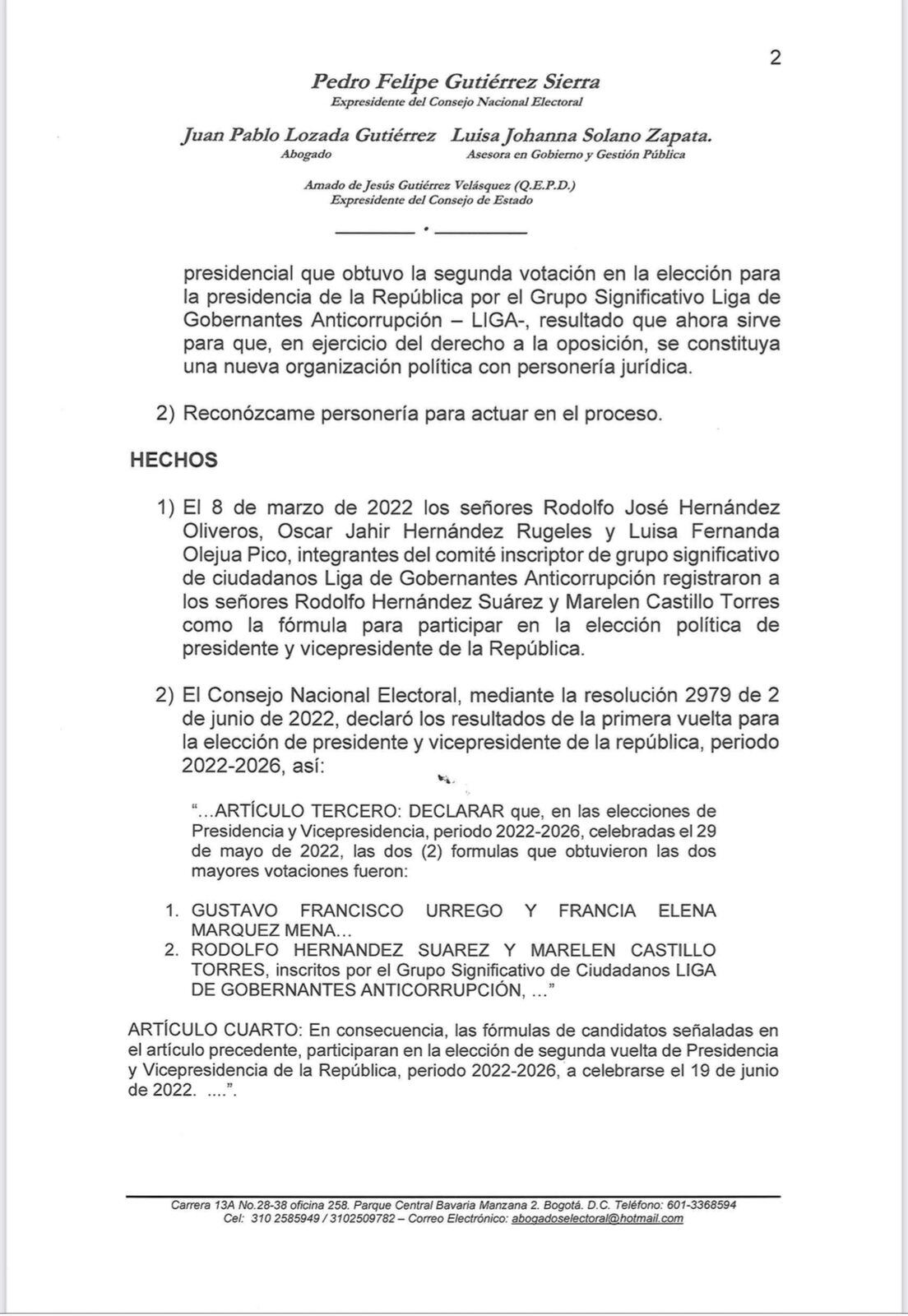 Después de la estrategia del exsenador Rodolfo Hernández, quien aceptó a curul en el Congreso y se declaró en oposición para lograr la personería jurídica que le permitiría entregar avales y recibir financiación estatal, el recurso presentado por Castillo pone en jaque a esa colectividad.
