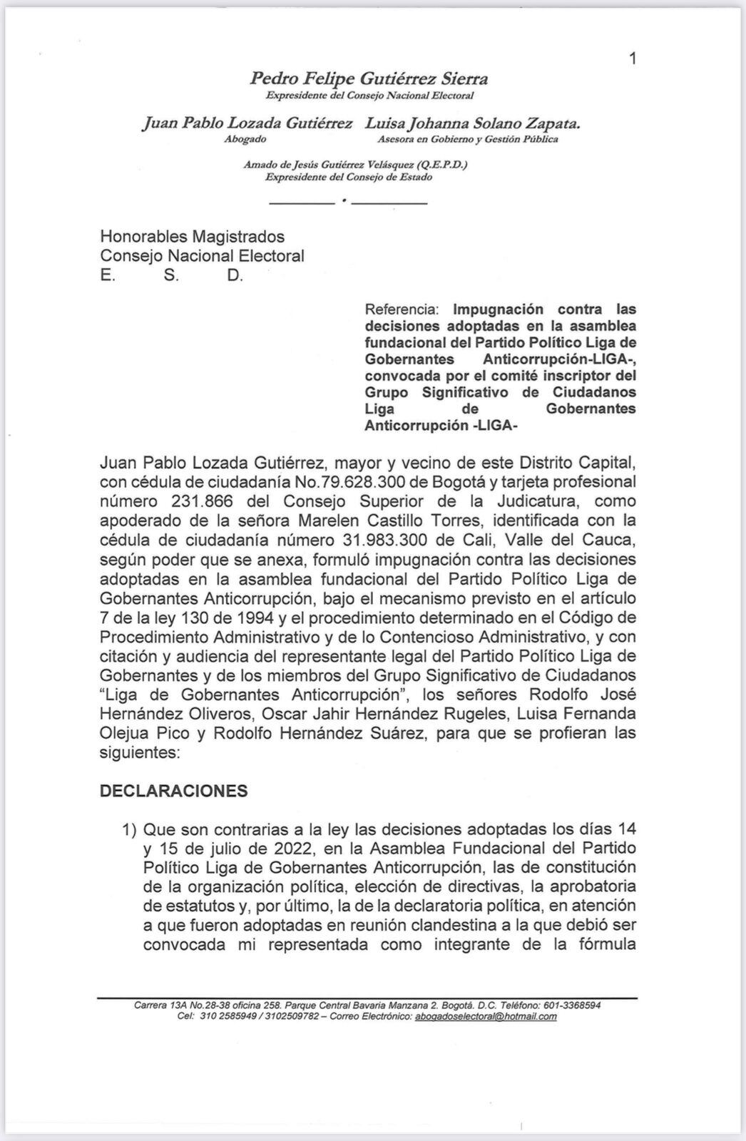 El Consejo Nacional Electoral recibió en las últimas horas un documento de 26 páginas con el que los abogados de la representante a la Cámara Marelen Castillo impugnan las decisiones tomadas durante la Asamblea que dio vida al partido Liga de Gobernantes Anticorrupción.