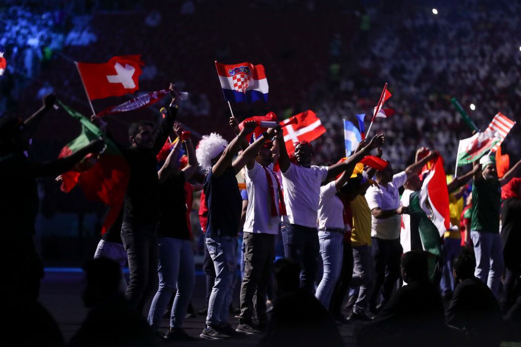 En la ceremonia hubo pequeños homenajes a las 32 selecciones, como breves fragmentos de canciones típicas con las que las aficiones las animan, y a ediciones precedentes de la Copa del Mundo, con la salida y despliegue de las mascotas, entre ellas Gauchito y Naranjito, así como con himnos de los últimos torneos, entre ellos el Waka Waka de Shakira.