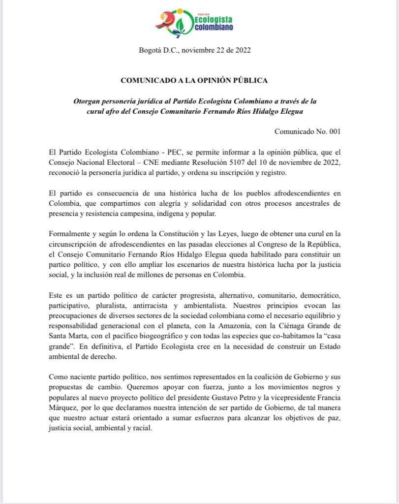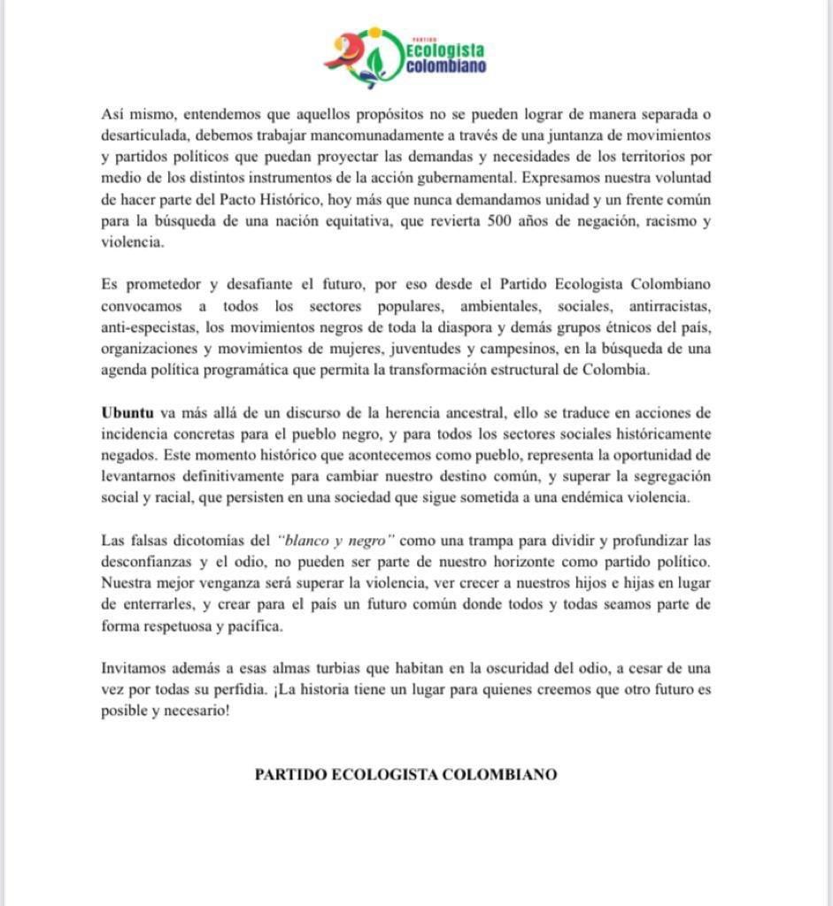 “Queremos apoyar con fuerza, junto a los movimientos negros y populares, al nuevo proyecto político del presidente Gustavo Petro y la vicepresidenta Francia Márquez, por lo que declaramos nuestra intención de ser partido de gobierno”, indica.