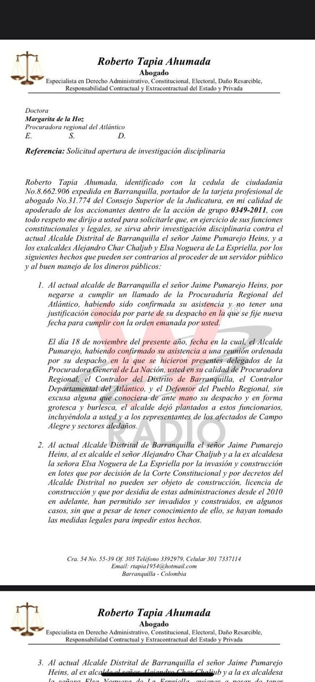 “La alcaldía de Barranquilla se permite informar a la opinión pública que el pasado viernes 18 de noviembre, funcionarios del Distrito atendieron una mesa de trabajo y seguimiento convocada por la Procuraduría Regional de Instrucción Atlántico, con el fin de analizar, revisar y establecer la situación relacionada con los inmuebles ubicados en el sector de Campo Alegre de esta ciudad.