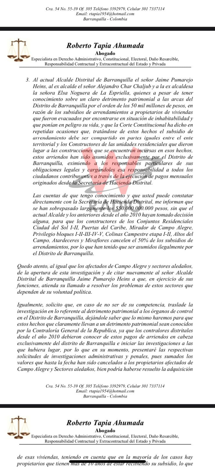 A través de un comunicado, las víctimas del caso de Campo Alegre, cientos de casas desarrolladas entre otras, por Constructora Alejandro Char, que registraron agrietamientos y caídas en 2010 hicieron pública su solicitud a la Procuraduría para que discipline al alcalde de Barranquilla, Jaime Pumarejo por “incumplir” reuniones donde se pactarían los pagos de las indemnizaciones y no tener “voluntad” para repararlos.