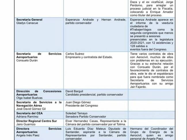 Uno de los nombres que allí aparecía era justamente el del empresario Carlos Guillermo Suárez Escobar. En ese momento dijimos que era un contratista favorecido con varios procesos, gracias a su estrecha relación con la señora Consuelo Durán, secretaria de Servicios Aeroportuarios. Tanto Suárez como Durán eran amigos de Jair Fajardo.