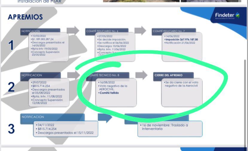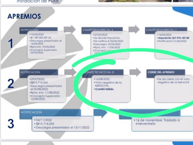 Sin embargo, Sigue la W conoció este documento en el que Findeter propuso una multa de $800 millones al consorcio por los graves incumplimientos, pero dos funcionarios de la Aerocivil votaron en contra de imponerles la sanción. Esos funcionarios son Cesar Lozada, director de Infraestructura y, nada y nada menos que la señora Consuelo Durán, la secretaria de servicios aeroportuarios y amiga del empresario contratista, Carlos Suárez Escobar.