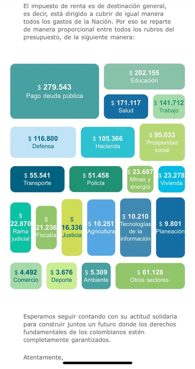 Y con la carta, también agregan un gráfico que explica cómo se distribuye el pago de la declaración de renta de la persona. Por ejemplo, cuánto irá para el pago de deuda pública, educación, salud, prosperidad social, y así sucesivamente.