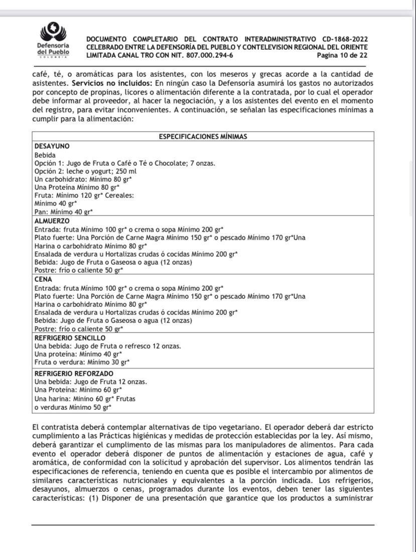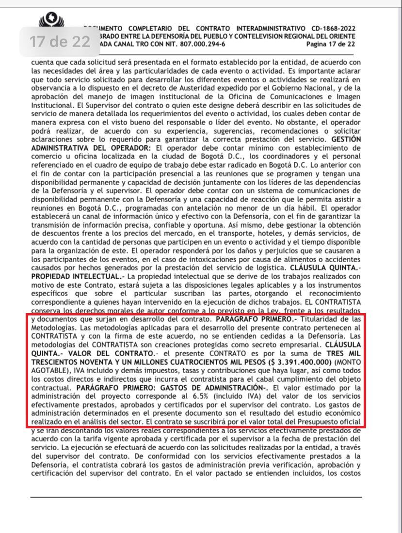 Dentro de este documento llama la atención el parágrafo en donde se deja claro la comisión que ganarán por este contrato Contelevisión Regional del Oriente Limitada Canal TRO.