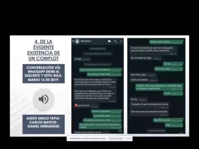 El fiscal Daniel Hernández señaló que el 16 de marzo de 2019, mediante conversaciones vía WhatsApp que documentó ante el Tribunal Superior de Bogotá, se evidencia la advertencia que le hizo Otto Bula sobre la idea de incriminarlo dentro de la investigación por el escándalo de Odebrecht.