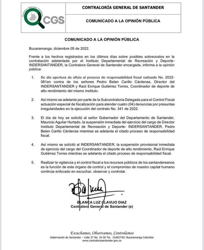 “El día de hoy se le solicitó al señor Gobernador del Departamento de Santander, Mauricio Aguilar Hurtado, la suspensión inmediata del ejercicio del cargo de Director del Instituto Departamental de Recreación y Deporte - Pedro Belén Carrillo Cárdenas - mientras se adelanta el citado proceso de responsabilidad fiscal”, se lee en el comunicado emitido por la Contraloría.